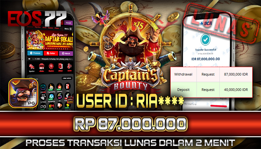 Selamat kami sampaikan kepada pemilik User ID: RIA**** yang berhasil meraih kemenangan besar melalui permainan Captain’s Bounty dengan total hadiah sebesar Rp 87.000.000. Setelah melakukan pengajuan withdraw, proses pencairan dana diproses dengan cepat dalam waktu sekitar 5–10 menit, dan pihak EOS77 langsung mengirimkan dana tersebut ke rekening yang terdaftar. Bukti transfer yang tersedia merupakan bukti resmi dan sah sesuai data transaksi dari bank tujuan.